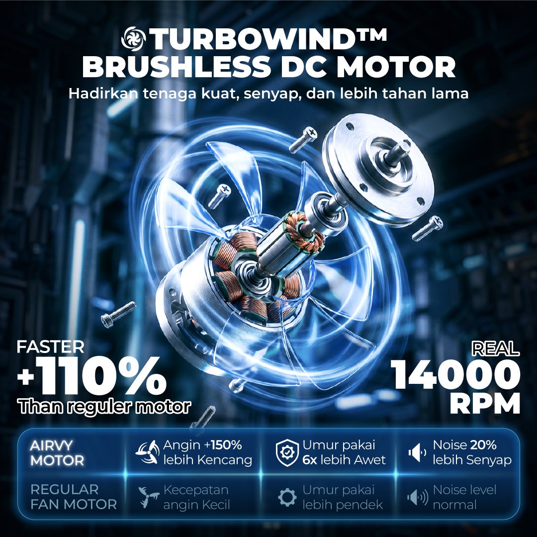 Teknologi TurboWind menggunakan sistem aliran udara bertekanan tinggi yang dirancang melalui optimalisasi saluran udara (airflow duct design) untuk menghasilkan hembusan angin yang lebih kuat, terfokus, dan memiliki jarak jangkau lebih jauh. Didukung motor turbo berperforma tinggi dengan torsi besar, kipas mampu menghasilkan putaran yang stabil, respons hembusan yang cepat, serta output aliran udara yang konsisten. Teknologi ini memastikan efisiensi pendinginan maksimal dengan tingkat kestabilan dan kenyamanan yang optimal untuk penggunaan indoor maupun outdoor.