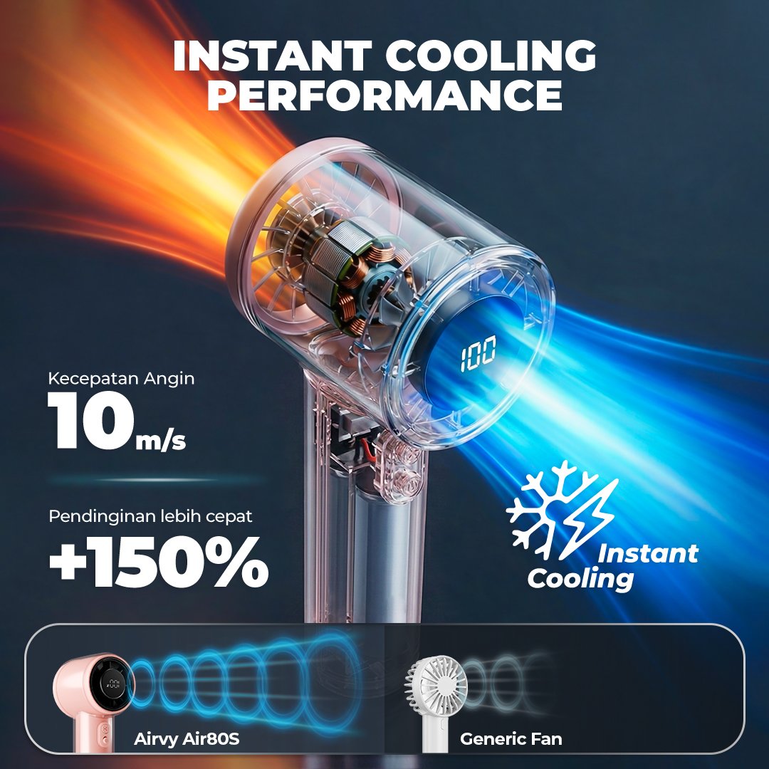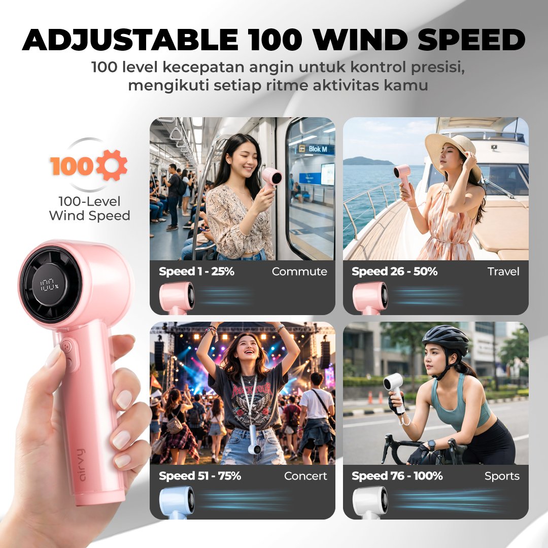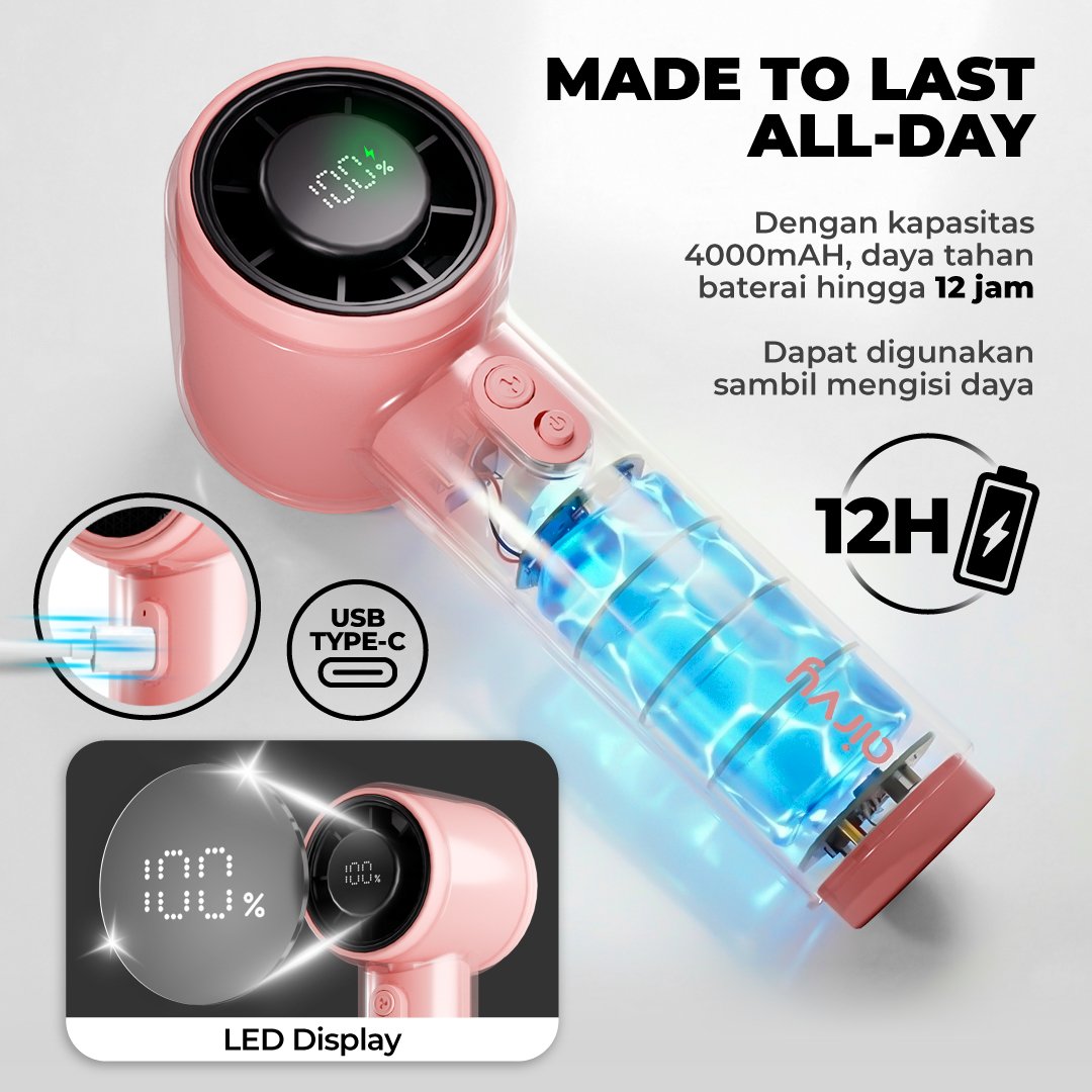 Ditenagai baterai Li-ion Real 4000mAh, perangkat ini menghadirkan daya tahan optimal dengan performa yang stabil dan konsisten. Sistem manajemen daya terintegrasi menjaga efisiensi energi sekaligus mempertahankan aliran udara sepanjang penggunaan. Dilengkapi port Type-C untuk pengisian yang lebih praktis dan modern, menjadikannya solusi ideal untuk mobilitas, aktivitas harian, hingga kebutuhan outdoor.