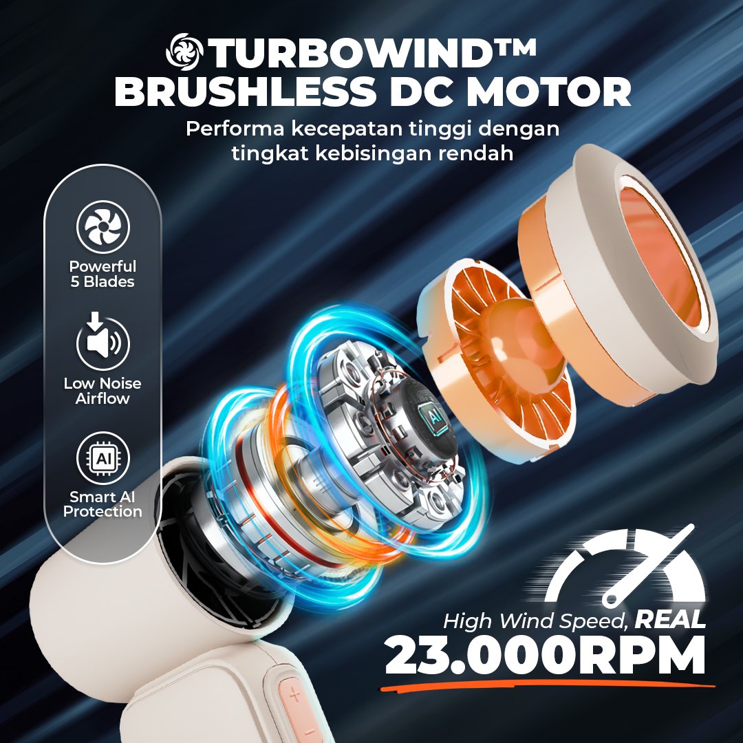 Experience next-level cooling engineered for performance, precision, and peace of mind. TurboWind™ combines a high-speed BLDC motor with smart AI protection, delivering powerful and smooth wind in an ultra-compact, travel-ready design.