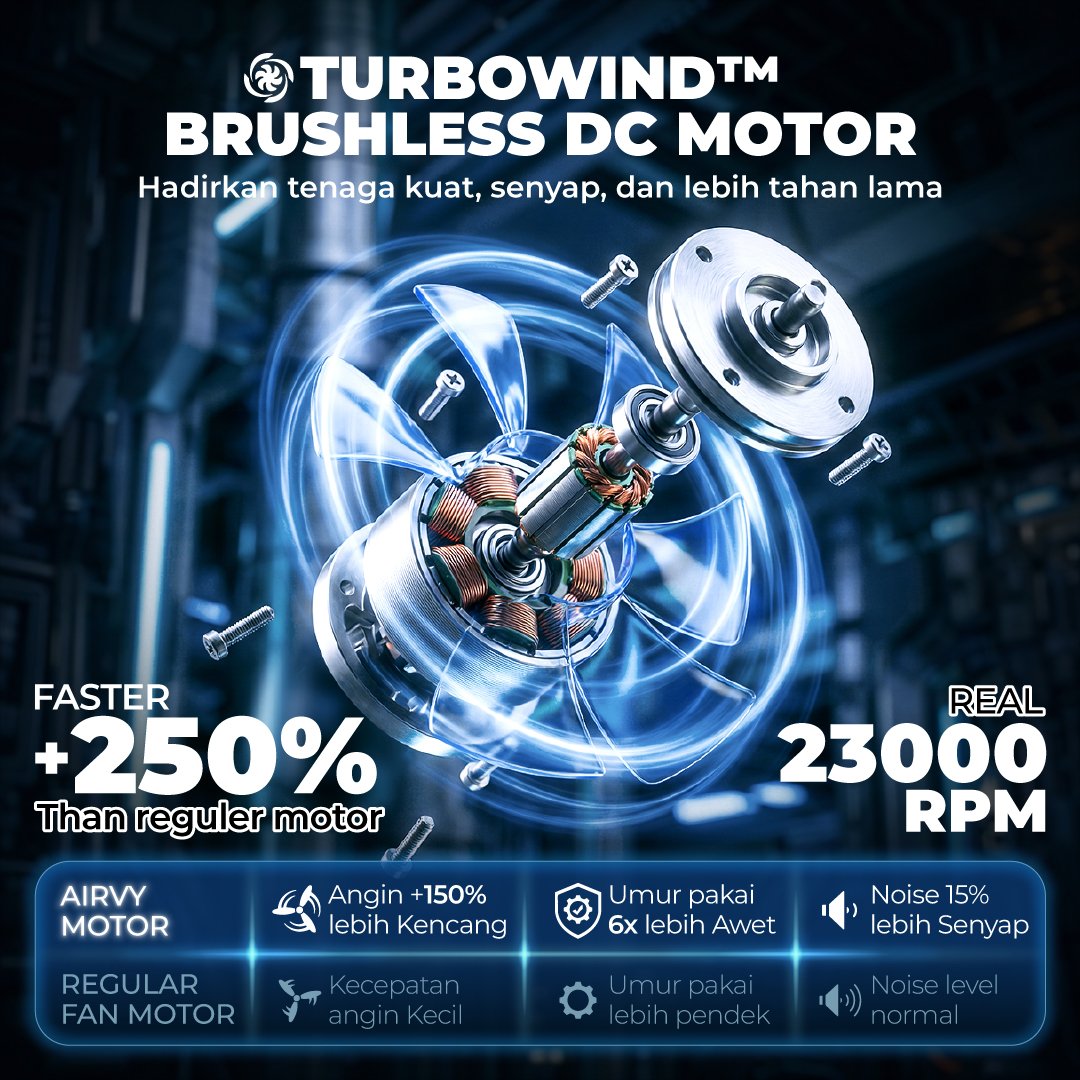 Teknologi TurboWind menggunakan sistem aliran udara bertekanan tinggi yang dirancang melalui optimalisasi saluran udara (airflow duct design) untuk menghasilkan hembusan angin yang lebih kuat, terfokus, dan memiliki jarak jangkau lebih jauh. Didukung motor turbo berperforma tinggi dengan torsi besar 23.000 RPM, kipas mampu menghasilkan putaran yang stabil, respons hembusan yang cepat, serta output aliran udara yang konsisten. Teknologi ini memastikan efisiensi pendinginan maksimal dengan tingkat kestabilan dan kenyamanan yang optimal untuk penggunaan indoor maupun outdoor.