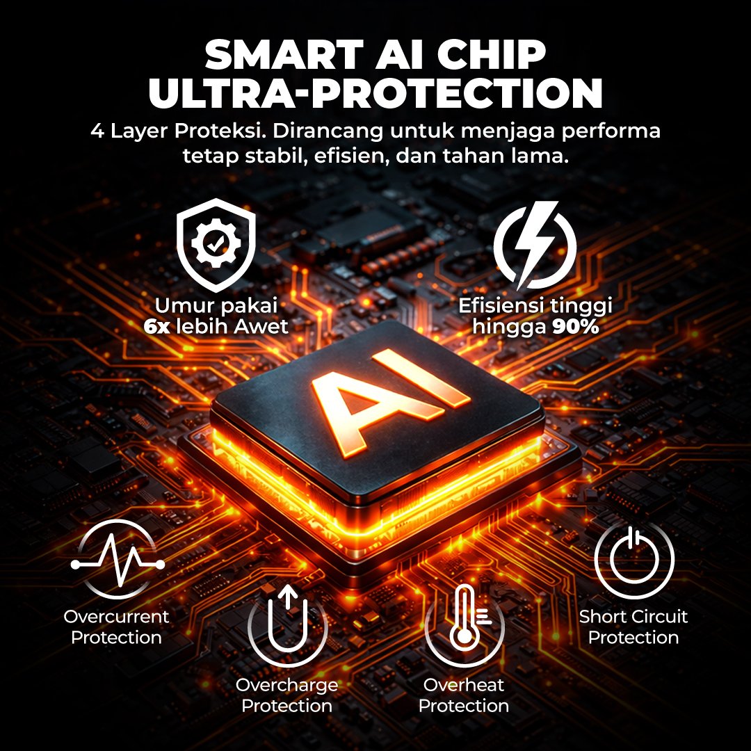 Didukung smart chip AI, teknologi ini memonitor kinerja kipas secara real-time untuk mengoptimalkan daya, suhu, dan kestabilan motor. Sistem secara otomatis menyesuaikan output agar hembusan tetap konsisten tanpa membebani komponen internal, sehingga performa lebih efisien dan awet. Dilengkapi perlindungan menyeluruh seperti overheat protection, overcurrent protection, short-circuit protection, dan overcharge/over-discharge protection. Sehingga kipas lebih aman digunakan dalam jangka panjang, konsumsi daya lebih terkendali, dan pengalaman pemakaian tetap nyaman—baik indoor maupun outdoor.