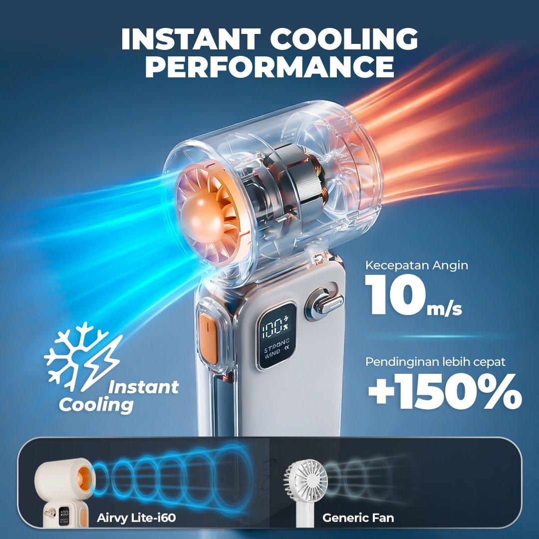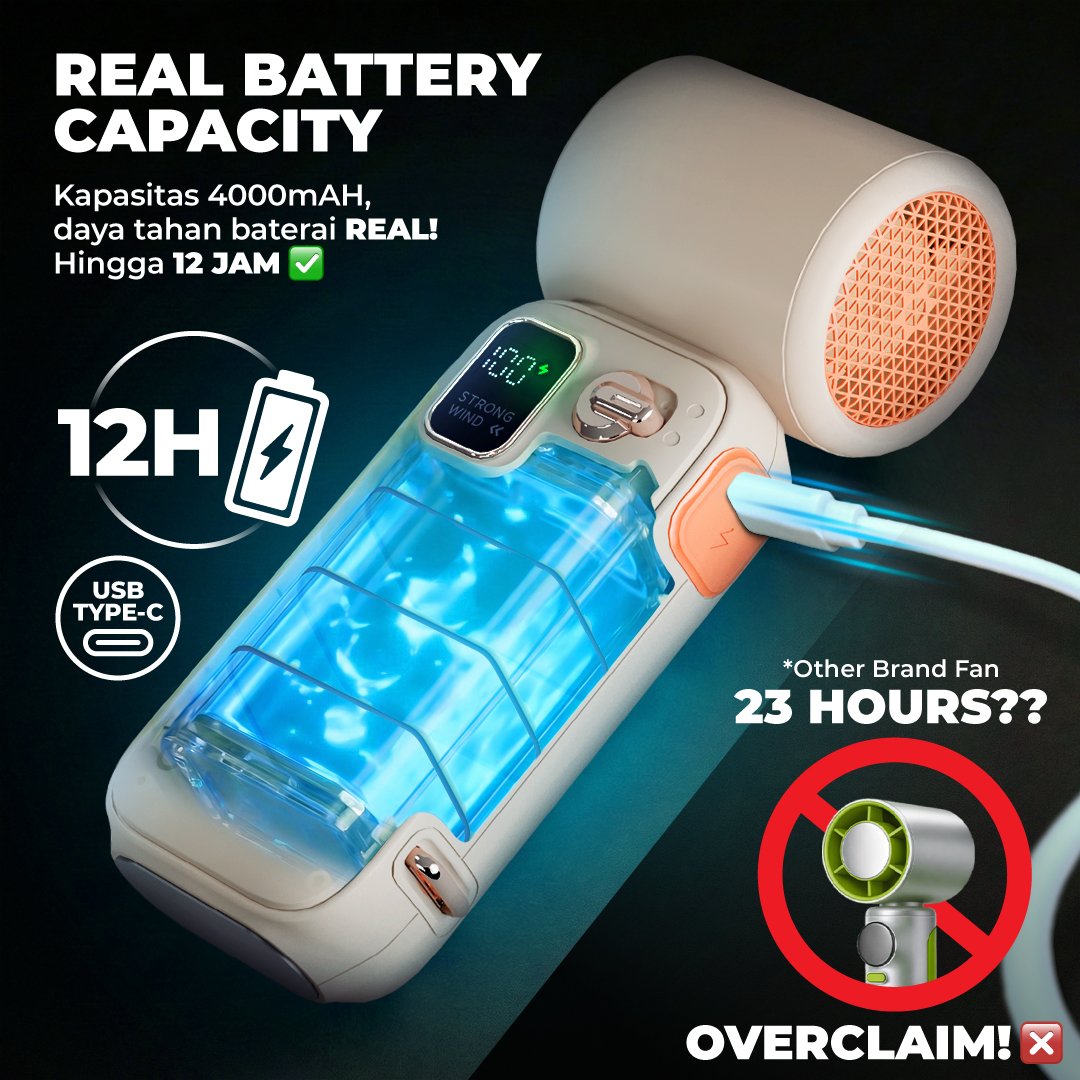 Ditenagai baterai Li-ion Real 4000mAh, perangkat ini menghadirkan daya tahan optimal dengan performa yang stabil dan konsisten. Sistem manajemen daya terintegrasi menjaga efisiensi energi sekaligus mempertahankan aliran udara sepanjang penggunaan. Dilengkapi port Type-C untuk pengisian yang lebih praktis dan modern, menjadikannya solusi ideal untuk mobilitas, aktivitas harian, hingga kebutuhan outdoor.